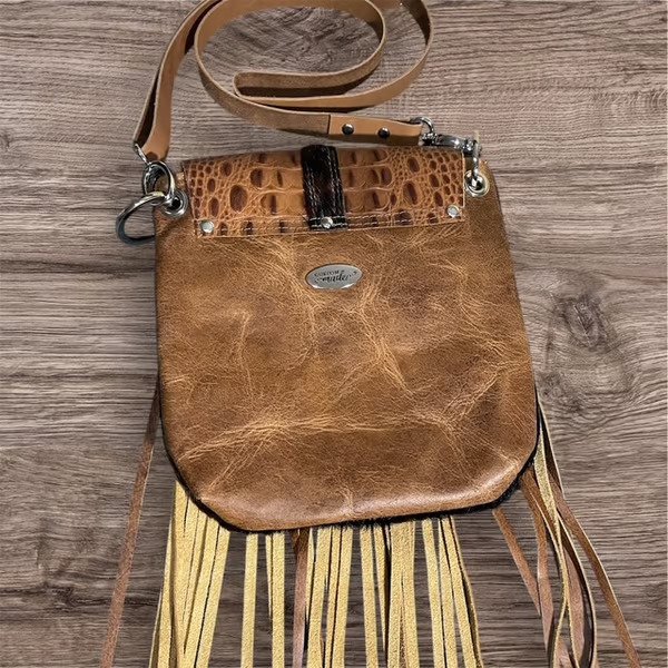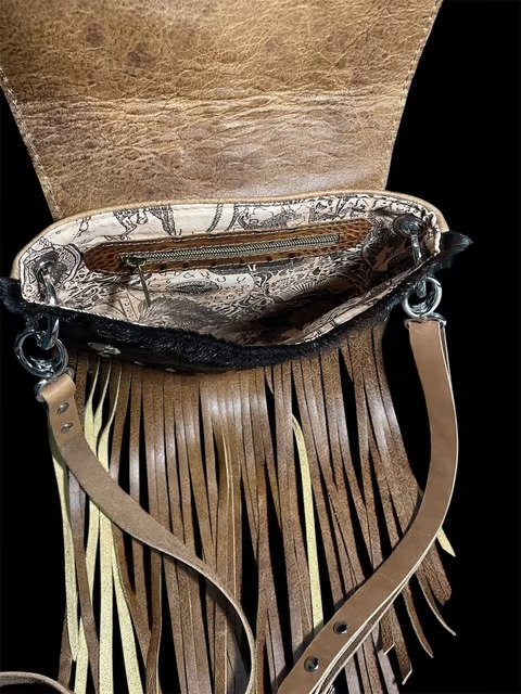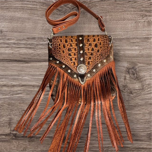 Handcrafted from high-quality tanned cowhide, this exquisite leather features a striking embossed gator pattern the adds an element of luxury to any accessory. This unique piece features beautiful rivet detailing, a one-of-a-kind concho and long flowing fringe that effortlessly adds a touch of bohemian charm to any ensemble. Handmade with meticulous attention to detail, each piece showcases the unique texture and natural variations of the hide, ensuring that no two items are exactly alike. The interior features a unique western motif design fabric with one zippered pocket and one slip pocket.